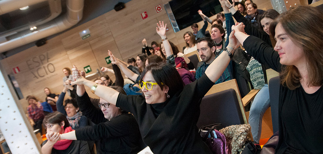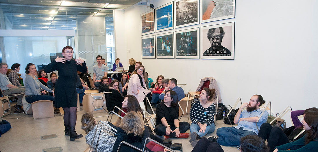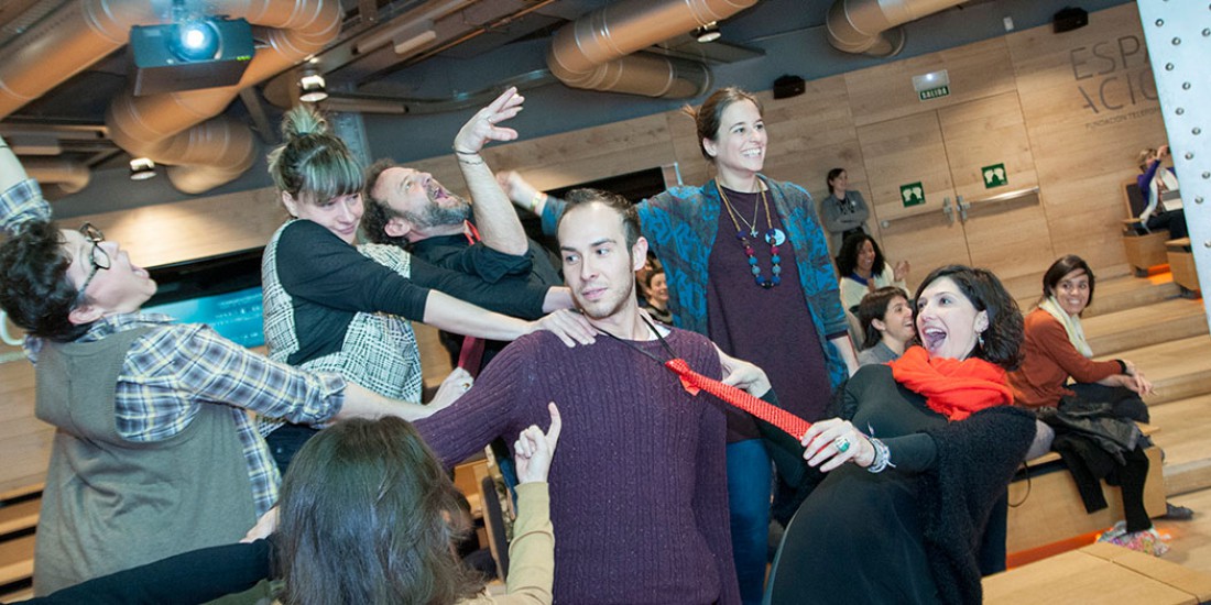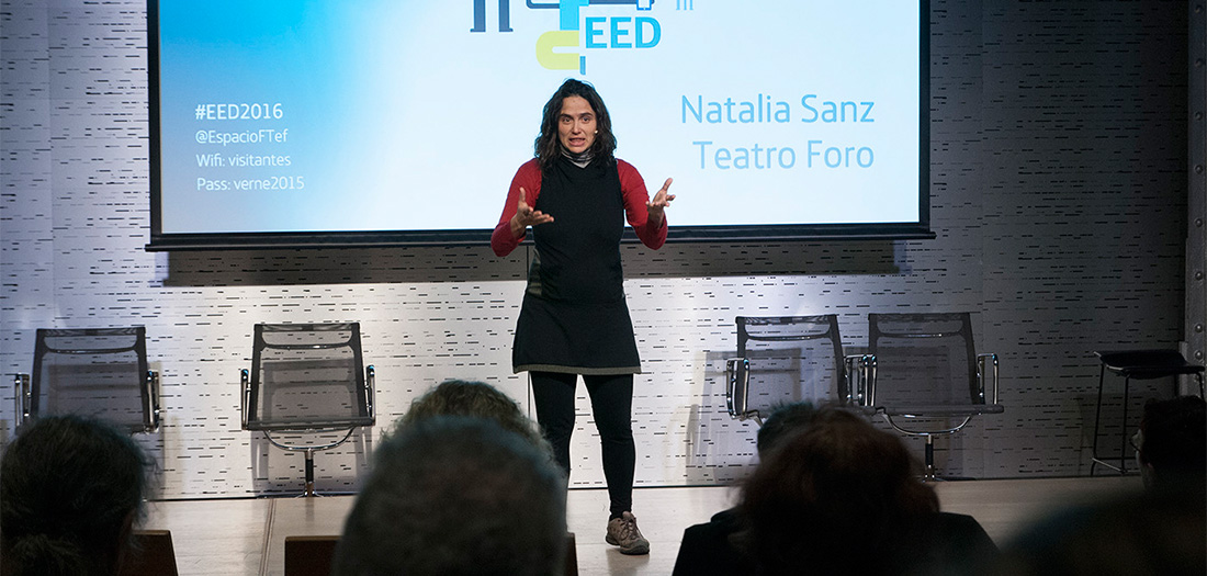 El pasado sábado 20 de enero la Escuela de Educación Disruptiva se subió al escenario en una sesión repleta de acción y movimiento. El primer turno le tocó a Natalia Sanz y a su propuesta en vivo de Teatro Foro, una técnica del Teatro del Oprimido de Augusto Boal, pedagogo y artista brasileño. Este tipo de dramaturgia permite investigar y generar conocimiento en el aula, no sólo sobre contenidos curriculares, sino también sobre otras competencias transversales.