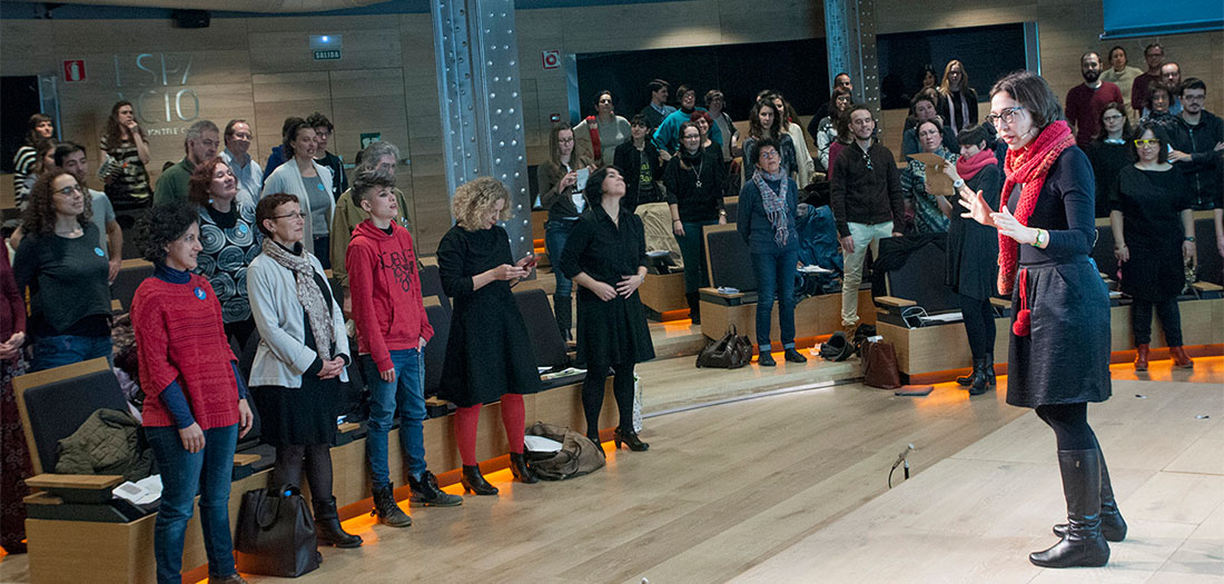 Tras las intervenciones en el auditorio pasamos al aula para llevar a cabo un taller impartido por Gloria Martín de Cuarta Pared. Su principal objetivo era proporcionar herramientas teatrales para colocar al profesor en el papel de actor y a los alumnos en el papel de espectadores. Se trabajó especialmente la idea de que lo que define al teatro es la base actoral, donde cuerpo, mente, corazón y acción se ponen en escena.