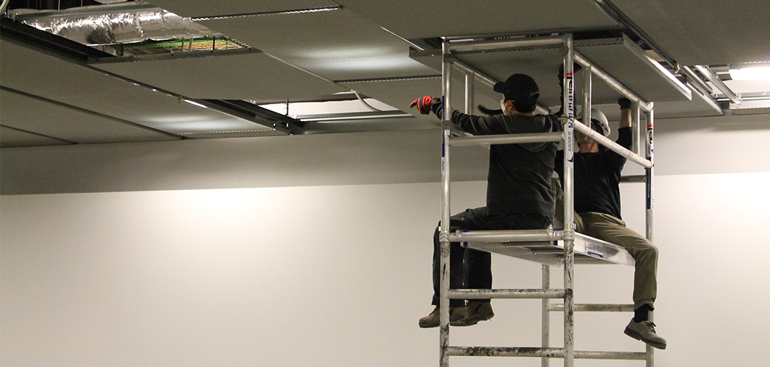 Otro fue el compuesto por personas de Ultra-lab, empresa con la que colaboramos regularmente en el Espacio, que se encargó de la colocación de las placas y el aislamiento lumínico de la sala (con colocación improvisada de trozos de moqueta en el vano central incluida).