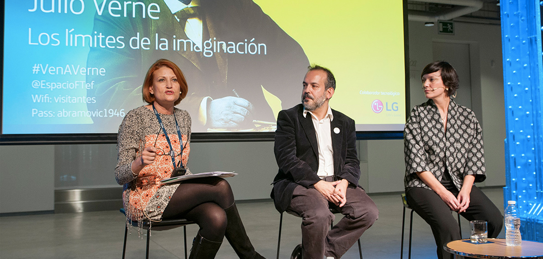 Los comisarios de la muestra, María Santoyo y Miguel Ángel Delgado -autores del proyecto Tesla. Suyo es el futuro que pudo verse en el Espacio el pasado año- ofrecieron una charla inaugural donde explicaron la propuesta de su trabajo expositivo, y nos iniciaron en un fascinante viaje por los personajes e invenciones de Julio Verne.