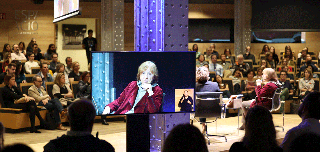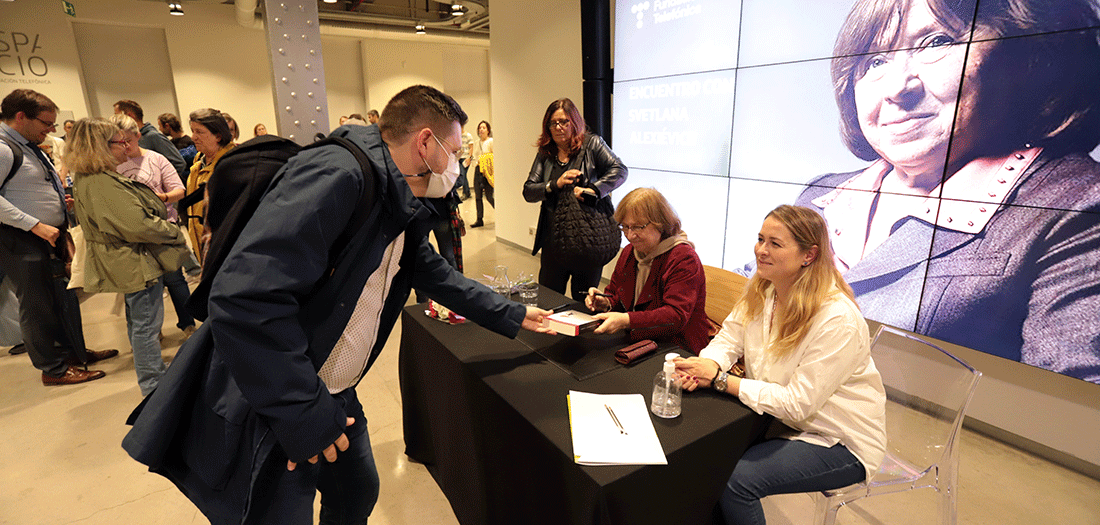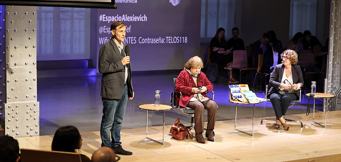 Este encuentro fue interpretado a LSE y se desarrolló en ruso y castellano; pudo seguirse en streaming en abierto desde esta esta web y en redes con el hashtag #EspacioAlexievich.