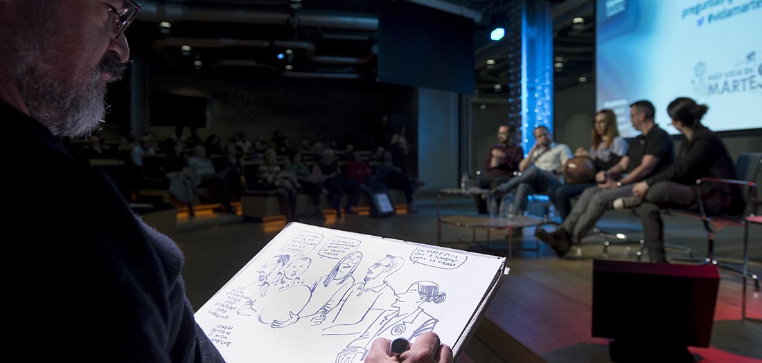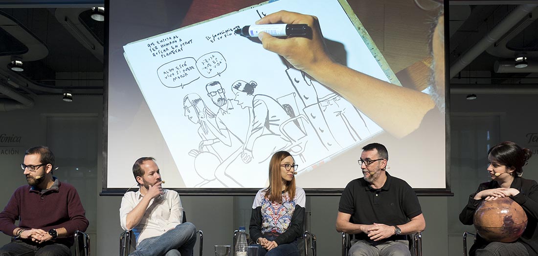 Como es habitual, nos acompañaron el dibujante Enrique Flores (@cuadernista ) y nuestros #martianos, grupo de jóvenes de entre 14 y 19 años,que aportaron su visión y su experiencia personal y generacional.