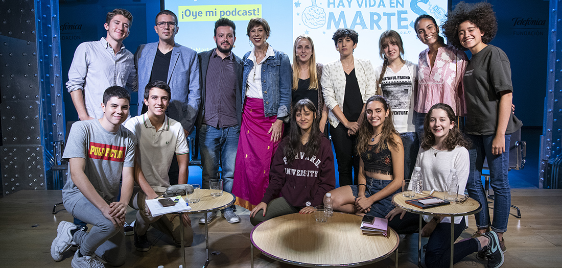 Para este encuentro, hemos contado con la participación de Jorge Marín, presidente de la MADPOD y podcaster, Laura Torner, responsable de comunicación en Ivoox, la plataforma de escucha de podcast líder en España, a David Mule, CEO del proyecto La Constante Series, y a María Jesús Espinosa de los Monteros, jefa de proyecto de Podium Podcast, en una conversación moderada por la periodista Sol Alonso. Como es habitual, nos han acompañado el dibujante Enrique Flores (@cuadernista ) y nuestros #martianos, grupo de jóvenes de entre 14 y 21 años, quienes han aportado su visión y su experiencia personal y generacional.
