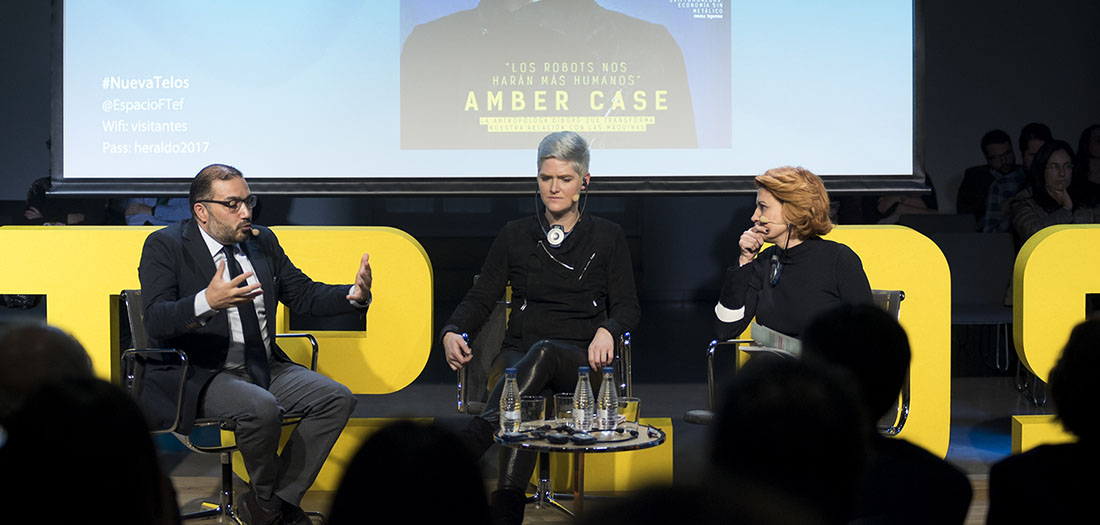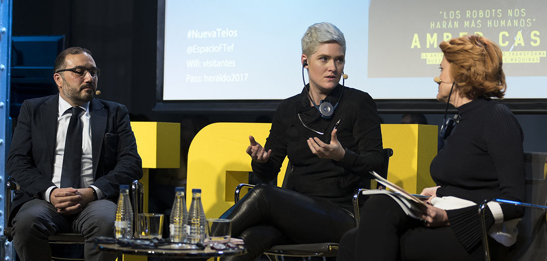 Después sería el turno de la charla que la propia Almudena Bermejo y Juan M. Zafra, Director de TELOS, mantendrían con Amber Case sobre el futuro de las calm technologies, el transhumanismo (la forma en la que la evolución del ser humano está unida a la transformación tecnológica) y  el avance que supone la tecnología en el campo de la educación.