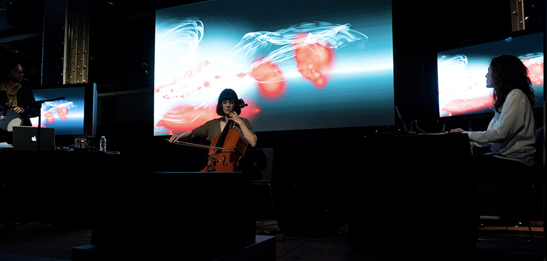 La parte audiovisual corrió a cargo de Alba G. Corral, quien reinterpretó algunas de las piezas de Campbell, jugando con la abstracción, el tiempo, la luz, los píxeles difuminados y dialogando con el sonido, creando paisajes abstractos en tiempo real que reaccionan a la música, alterando la percepción de las formas y creando un propio dialogo visual basado en la temporalidad y el concepto de la luz. Reflexionó sobre el tiempo y la construcción de la imagen abstracta. Elementos que forman parte del imaginario de este artista y que son referencias actuales para la creación audiovisual digital.