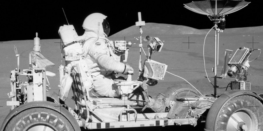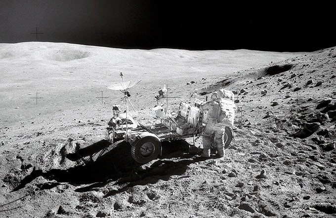 R de Rover lunar. En los tres últimos viajes de la NASA a la Luna, los astronautas utilizaron un vehículo todoterreno para desplazarse por la superficie del satélite.