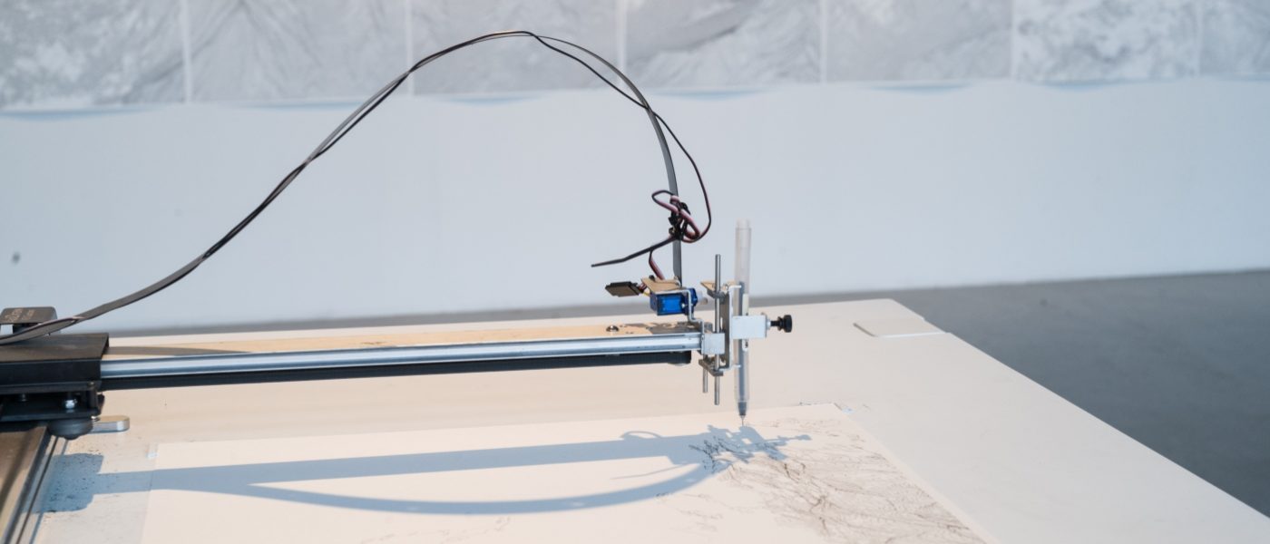 🌿 Explorador y cartógrafo. Durante sus expediciones, Lemercier practica la fotogrametría: una técnica para construir cartografías a partir de fotos del entorno. En 2018 recorrió los desiertos estadounidenses de California, Nevada, Utah, Arizona y Nuevo México con solo dos compañeros de viaje: un dron, equipado con una cámara, y un pequeño plóter recargable con energía solar con el que retrataba el relieve de valles, dunas y cordilleras. Las imágenes recogidas por el dron nos muestran a Lemercier trabajando sobre el campo, planificando el viaje y el proyecto mientras el plóter, programado para ello, traza pausadamente la topografía. Un proceso lento y condicionado por los elementos naturales – el viento, el polvo que afectan al trabajo de la máquina – que es una metáfora del moldeado natural del paisaje.