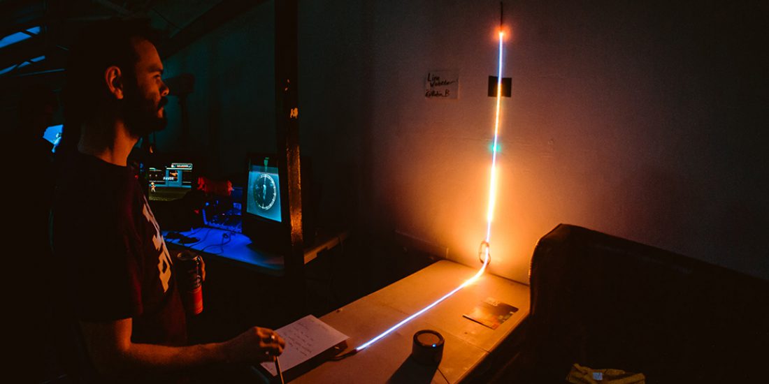 Robin Baumgarten- En la exposición #VideojuegosLaExpo voy a presentar Line Wobbler, un juego dungeon crawler unidimensional. Es un experimento sobre el minimalismo en los videojuegos que juega con el concepto de qué puede considerarse como tal. Se utiliza un resorte metálico como joystick y todo se muestra en una única línea de luces, desde el jugador en verde, pasando por los enemigos en rojo, las piscinas de lava, las peleas con los jefes y las puntuaciones más altas. Esta pantalla unidimensional se inserta en un mundo tridimensional, lo que hace que cada instalación sea única y dependa de la arquitectura del espacio.