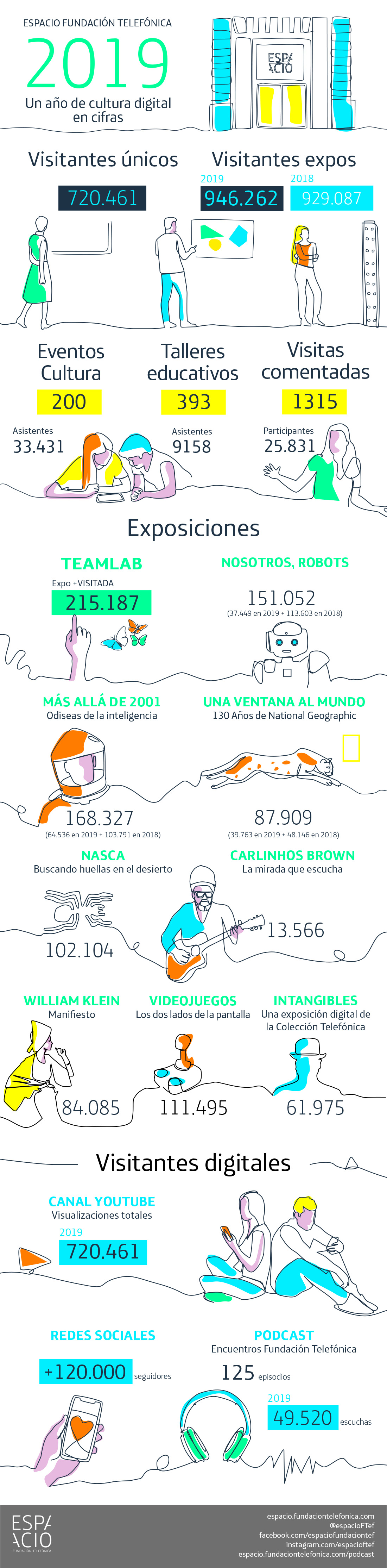 700.000 personas han visitado el Espacio Fundación Telefónica en 2019 y han participado en las diferentes actividades educativas y culturales, exposiciones, debates, encuentros y experiencias tecnológicas en sus más de 6.000 m2. Entre las exposiciones más visitadas de 2019 se encuentran la del colectivo japonés teamLab, con más de 215.000 visitantes, Videojuegos. Los dos lados de la pantalla, con 112.000 visitantes, Nasca. Buscando huellas en el desierto y Nosotros. Robots.