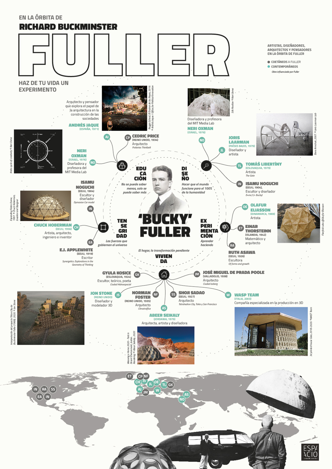 Esta pieza infográfica visualiza la influencia y el legado de la obra del arquitecto, diseñador y visionario Buckminster Fuller en grandes artistas e intelectuales del s. XX y XXI.