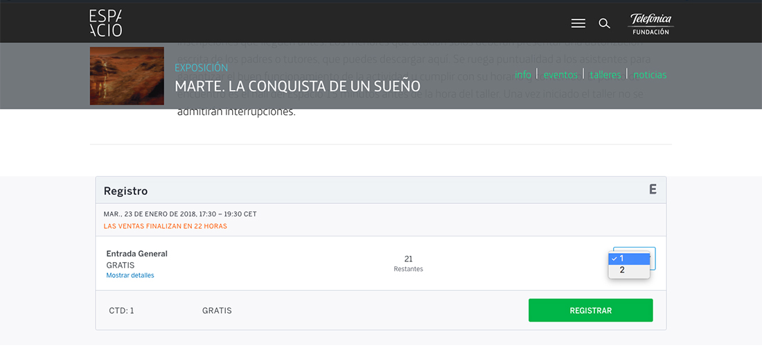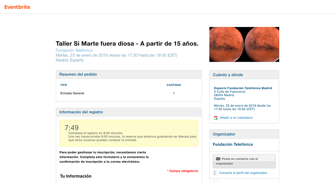 ¡Ah! Si vas a llevar un acompañante menor no te olvides de indicarlo ni de descargarte el documento de cesión de derechos de imagen firmado por su tutor legal y aceptar también que no podrán entrar sin la autorización firmada, nuevamente, por su tutor legal. Entre las grandes ventajas de este nuevo sistema se encuentra la posibilidad de apuntarte a una lista de espera en el caso de que estén completas todas las plazas, y de recibir un recordatorio del inicio del curso unos días antes. Desde este mail recordatorio podrás cancelar además tu asistencia en el caso de que no puedas acudir.