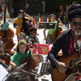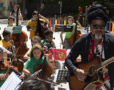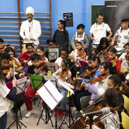Durante la visita al centro, la Orquesta Da La Nota ofreció a Carlinhos Brown un pequeño concierto. El artista no tardó en participar, y dedicó a los niños y a sus familias unas palabras sobre la importancia de la música en la educación.